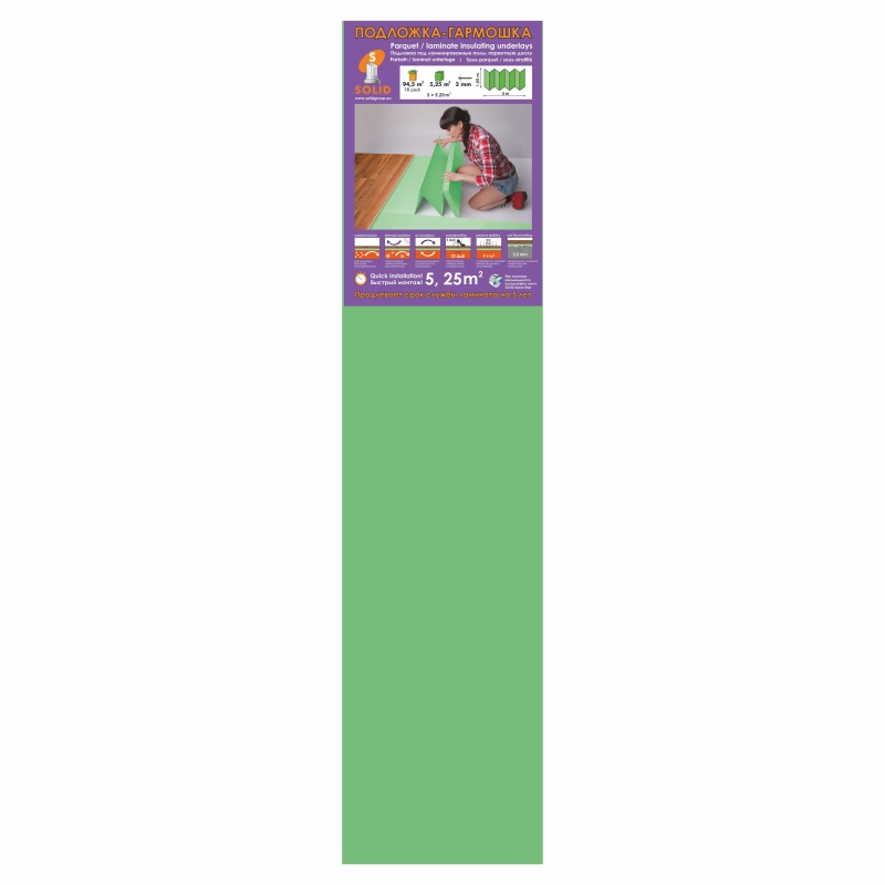 Общие характеристики : Подложка-гармошка Солид не только: -выравнивает поверхность -обеспечивает необходимую шумо-,влаго- и термоизоляцию -имеет нормативные показатели устойчивости к нагрузкам и циркуляции воздуха Но и имеет значительное конкурентное преимущество за счет исключительных потребительских свойств, таких как скорость и удобство монтажа, т.к. все листы подложки уже скреплены между собой.